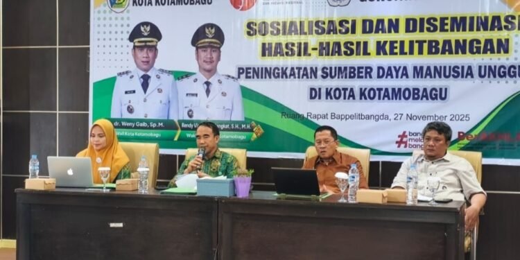 KOTAMOBAGU – Dibuka Asisten Perekonomian dan Pembangunan Setda Kota Kotamobagu, Adnan Massinae, Pemerintah Kota (Pemkot) melalui Badan Perencanaan Penelitian dan Pengembangan Daerah (Bappelitbangda) menggelar sosialisasi dan diseminasi hasil kelitbangan, diruang Rapat Bappelitbangda. Kamis (27/11/2025).