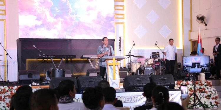 Kotamobagu – Wali Kota Kotamobagu, dr. Weny Gaib, Sp.M., menghadiri kegiatan Indonesia Menyembah 25 Jam Tahun 2025 Chapter Bolaang Mongondow Raya yang dilaksanakan PELTAP GPdI Bolaang Mongondow Raya di Gedung GPdI Eben Haezer Sia, Desa Sia Kecamatan Kotamobagu Utara, Jumat (10/10/2025).